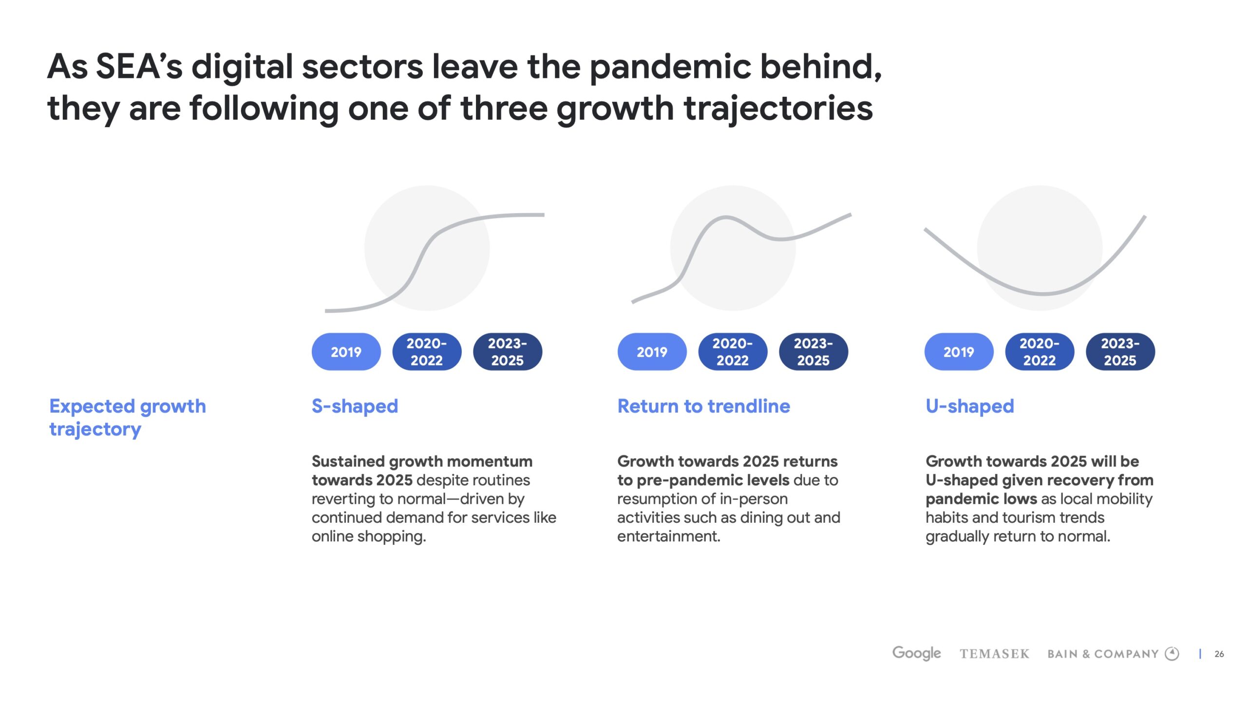 陈述指出,现阶段,东南亚数字经济范畴的开展正遭到电商职业的继续加速、外卖&在线媒体职业向疫情前状况的康复、以及游览&交通职业的久远复苏这三大趋势的影响。详细而言,依据陈述,这三大趋势现在正出现出各不相同的开展状况: