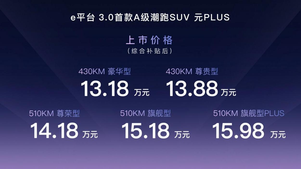 比亚迪e渠道3.0首款A级潮跑SUV——元PLUS正式上市,新车共5款车型,官方指导价13.18万元——15.98万元,并推出五大专享礼遇。