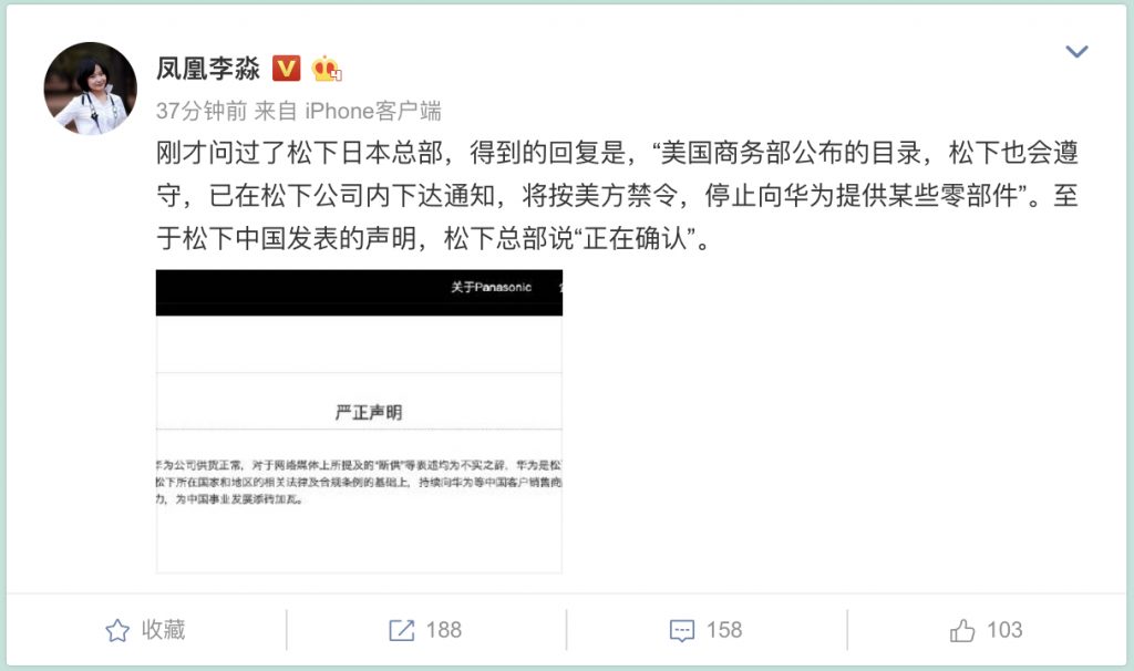 5 月 23 日 12:01 更新:松下发声明否定“断供华为”。原文标题已做修正。