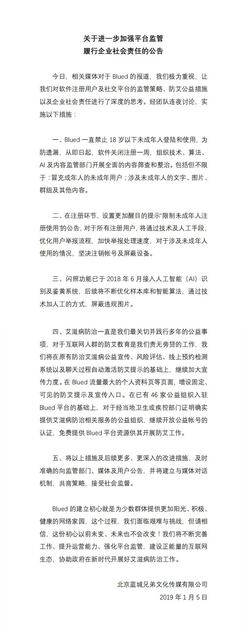 称,Blued 在供给服务时没有身份核对机制,用户能够随意填写年纪,导致该渠道存在不少未成年用户。报导称,Blued渠道上,还存在色情、毒品、卖淫等信息。财新周刊这篇报导还引证一位研讨男同性恋人群多年的学者十个月的接连调研成果称,不少未成年用户的不安全性行为都与 Blued 有关。Blued 在公告中表明,未来将在运用的注册环节设置愈加夺目的提示“约束未成年人注册运用”的公告,对一切注册用户,将经过技能及人工手法,优化告发流程,加速告发处理速度,关于触及未成年人运用的状况,坚决刊出账号及屏蔽设备。