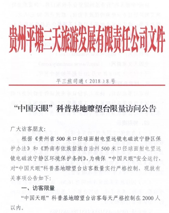 公告显现,依据《贵州省500米口径球面射电望远镜电磁波安静区维护方法》和《黔南布依族苗族自治州500米口径球面射电望远镜电磁波安静区环境维护法令》,为保证“我国天眼”安全运转,“我国天眼”科普基地瞭望台访客每天严厉控制在2000人以内。