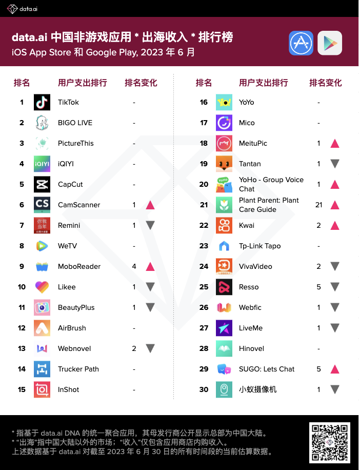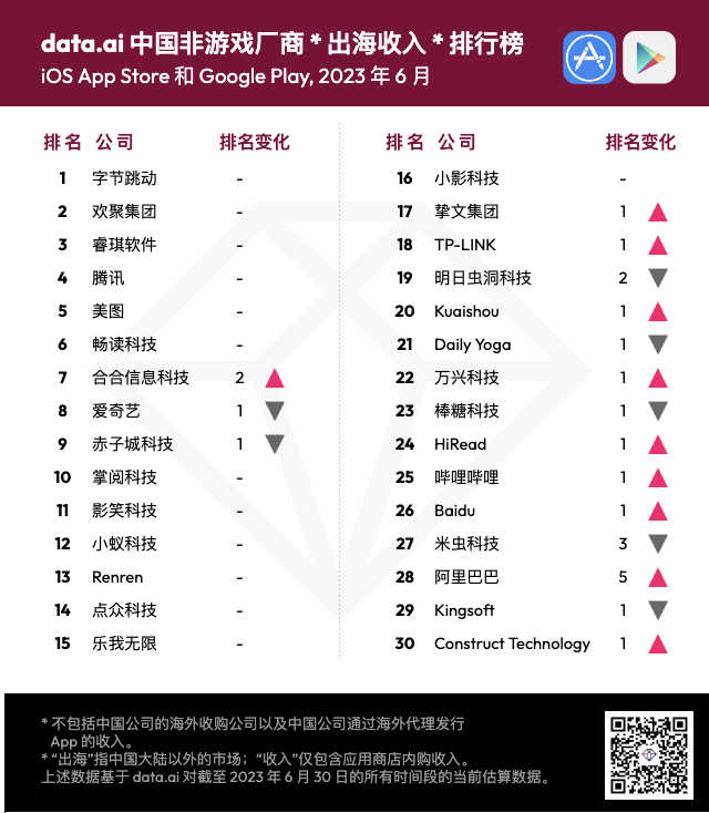 data.ai发布了2023年6月我国非游戏厂商及运用出海收入30强榜单,以下是具体内容: