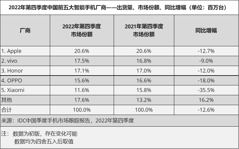 2022年第四季度及全年五大智能手机厂商商场体现: